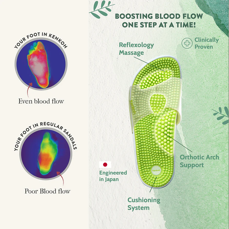 At Kenkoh, we believe that health starts from the sole of your feet. Kenkoh’s signature massaging footbed is based on centuries-old reflexology principles. It has been researched and perfected in Japan since 1949. We envision a world where everyone can enjoy the benefits of improved circulation, increased energy, release of endorphins and foot pain management, naturally and simply by walking.